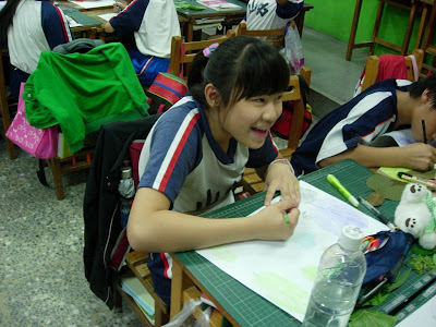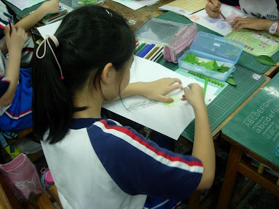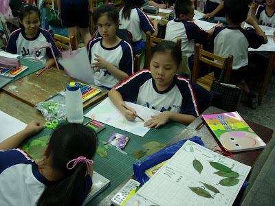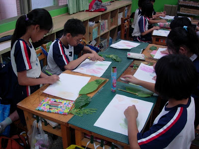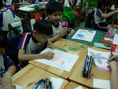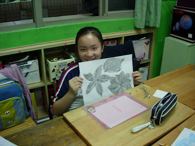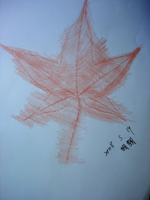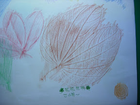 先準備材料色筆、葉片和紙張先將葉子壓平(在書本壓三、五天)再來的就是選洽當的顏色(深色為宜)仔細小心刮出完整的作品再簽上大名大功告成了...